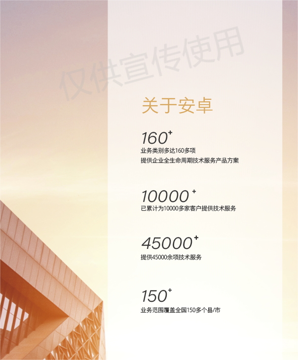 未來安卓工程將恪守以客戶為中心、以奮斗者為本、團(tuán)隊(duì)第一、誠實(shí)守信、自我批判、開放進(jìn)取的核心價值觀;致力于專業(yè)技術(shù)服務(wù)事業(yè)、為社會安寧、人民安康、企業(yè)安全保駕護(hù)航;努力成為安卓家人實(shí)現(xiàn)夢想的事業(yè)平臺,全力打造中國規(guī)模最大、業(yè)務(wù)最全、技術(shù)最強(qiáng)、服務(wù)最好的綜合技術(shù)服務(wù)平臺。